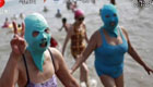 海边戏水要防晒 女子头戴尼龙面罩