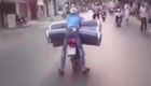 实拍小伙趴在货上开摩托