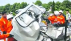 【解说】接到报警后,当地消防部门立即赶往现场救援。现场只见一辆大货车侧翻在马路旁,地上布满了一层厚厚的水泥粉,路旁的树木被撞倒了许多,车厢内水泥已经基本散落到路旁的山坡下,货车车头在猛烈撞击后变形严重,一男子被困驾驶室内。